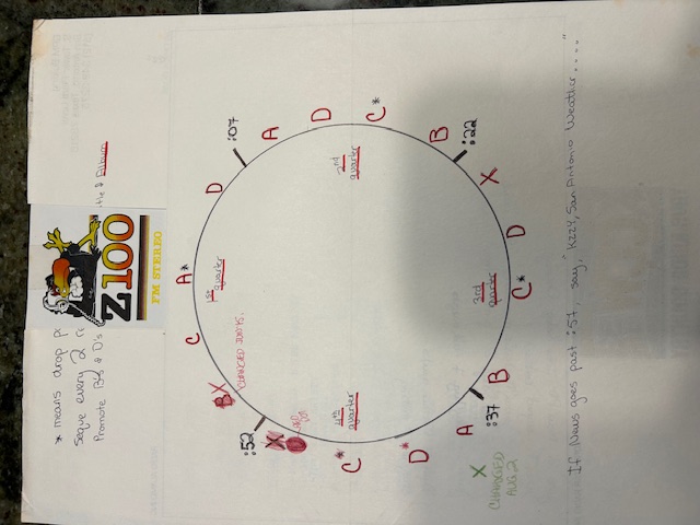 One version of the KZZY Hot Clock created by Program Director John Lodge which indicated the type of song that should be played by jocks in a given hour. (courtesy of Marc Roy)
